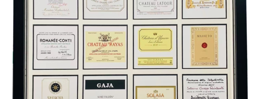 • Encadrement décoratif composé de plusieurs étiquettes de grands vins et crus prestigieux, idéal pour décoration murale autour du vin