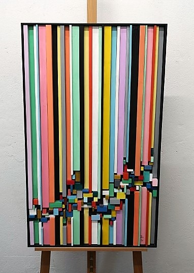 ACA002, « Oeuvre en bois », collage, encadrement noire, 60x100cm.