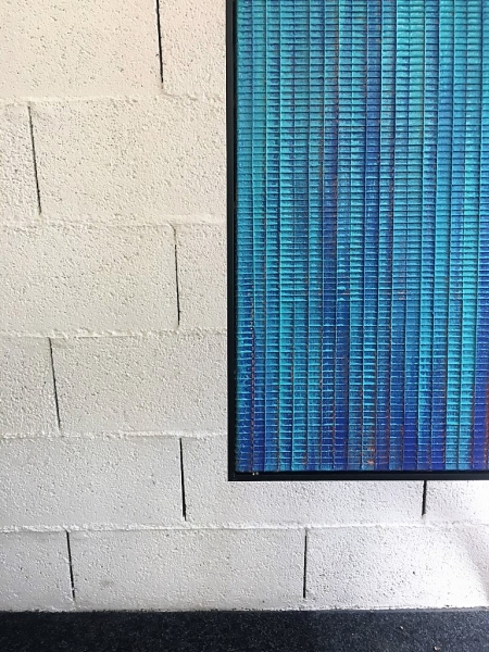 AC046H, Création, peinture à l’huile, collage à la corde, encadrement baguettes noires, 120x160cm.