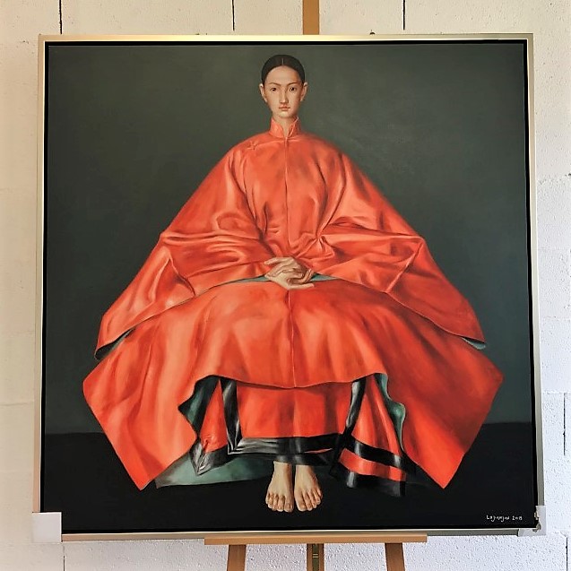 ACF004, Peinture à l’huile, « Chinese lady with red dress « , encadrement silver, 120x120cm.