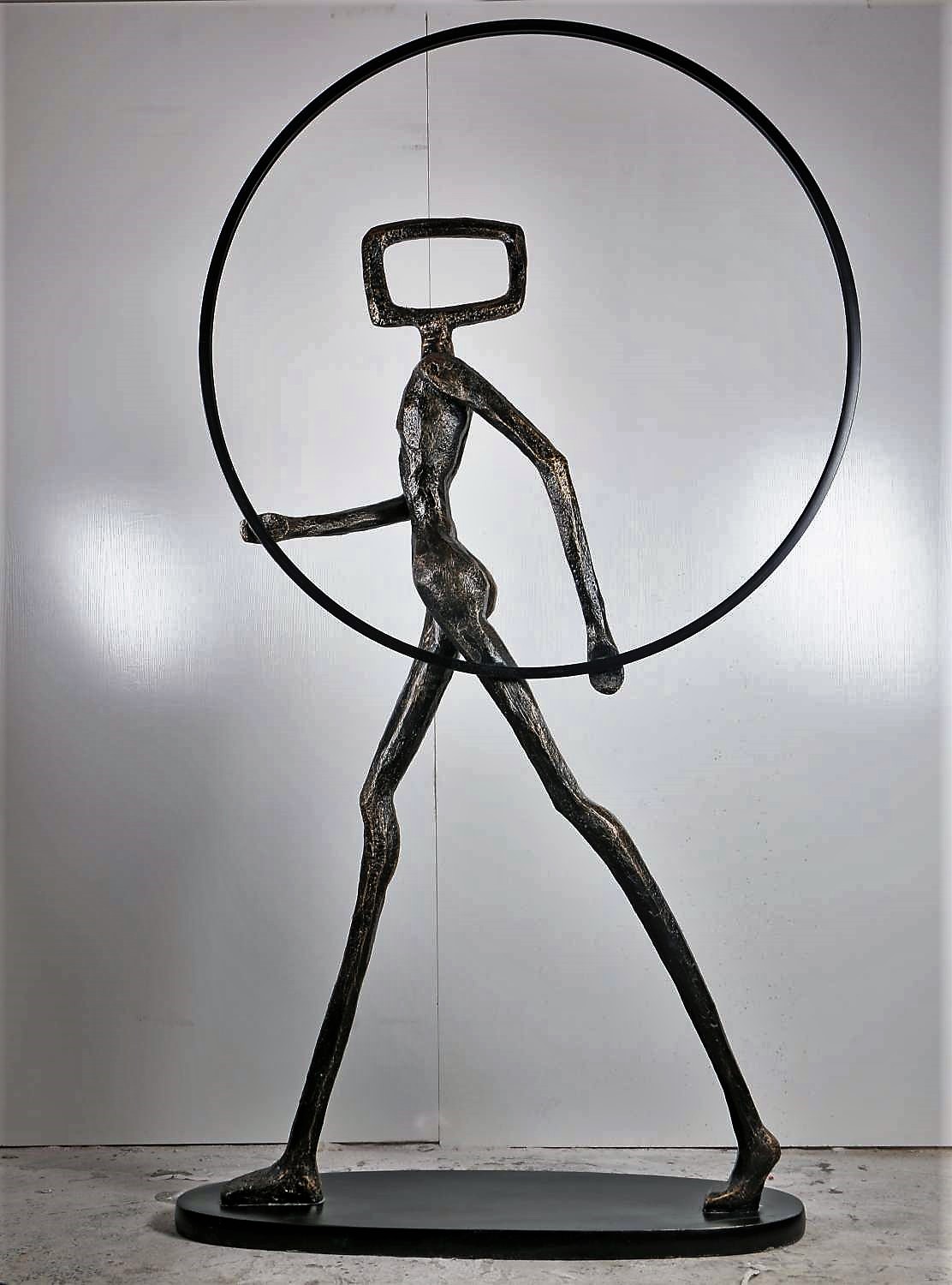 AT080A, Grande sculpture, « FEMME AU CERCLE » en résine finition bronze, pour l’intérieur.