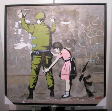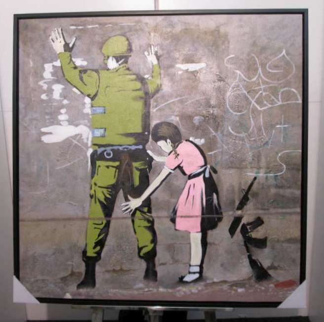 IR014A, BANKSY, la fillette et le soldat, peinture à l’huile, 100x100cm.