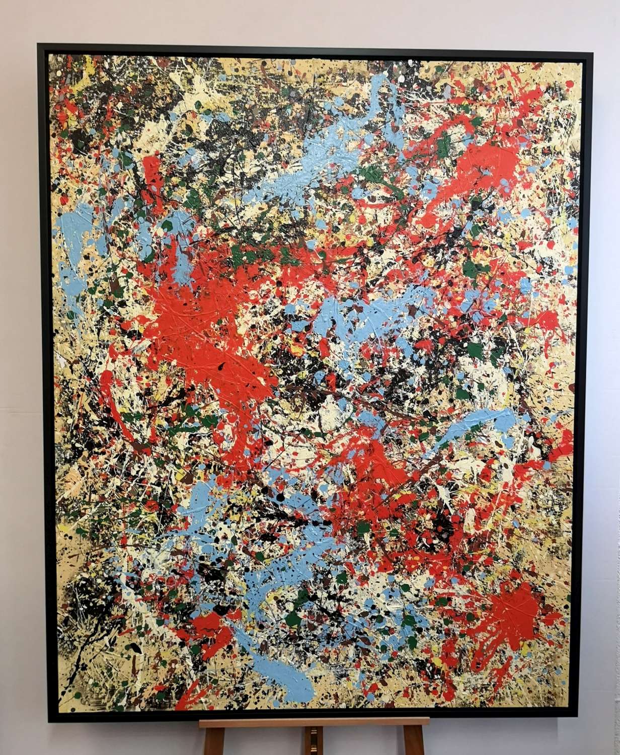 IR009C, Reproduction à la manière de J.POLLOCK, peinture à l’huile, encadrement baguette américaine noire, 125x185cm.