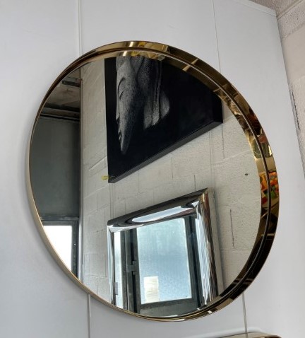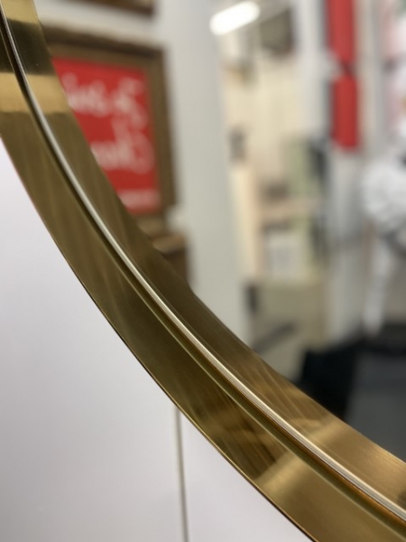 MI032, Miroir MADEMOISELLE, rond diamètre 75cm, gold, avec rebord métal extérieur 5cm et intérieur 3cm.