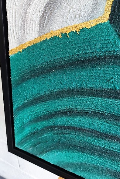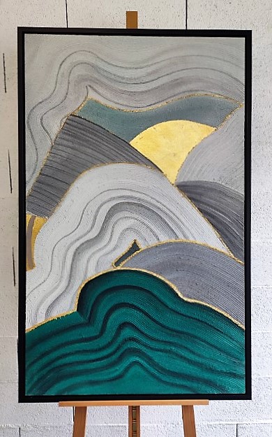 SD043I, « ABSTRAIT COUCHE DE SOLEIL », œuvre, texturé, peinture à l’huile, encadrement baguettes américaine noires, 85x135cm.