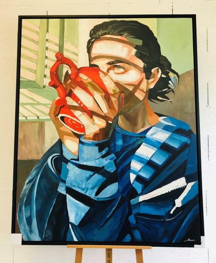 SD046D, Lever de soleil, oeuvre signée, peinture à l’huile, encadrement baguette américaine noire, 155x125cm.
