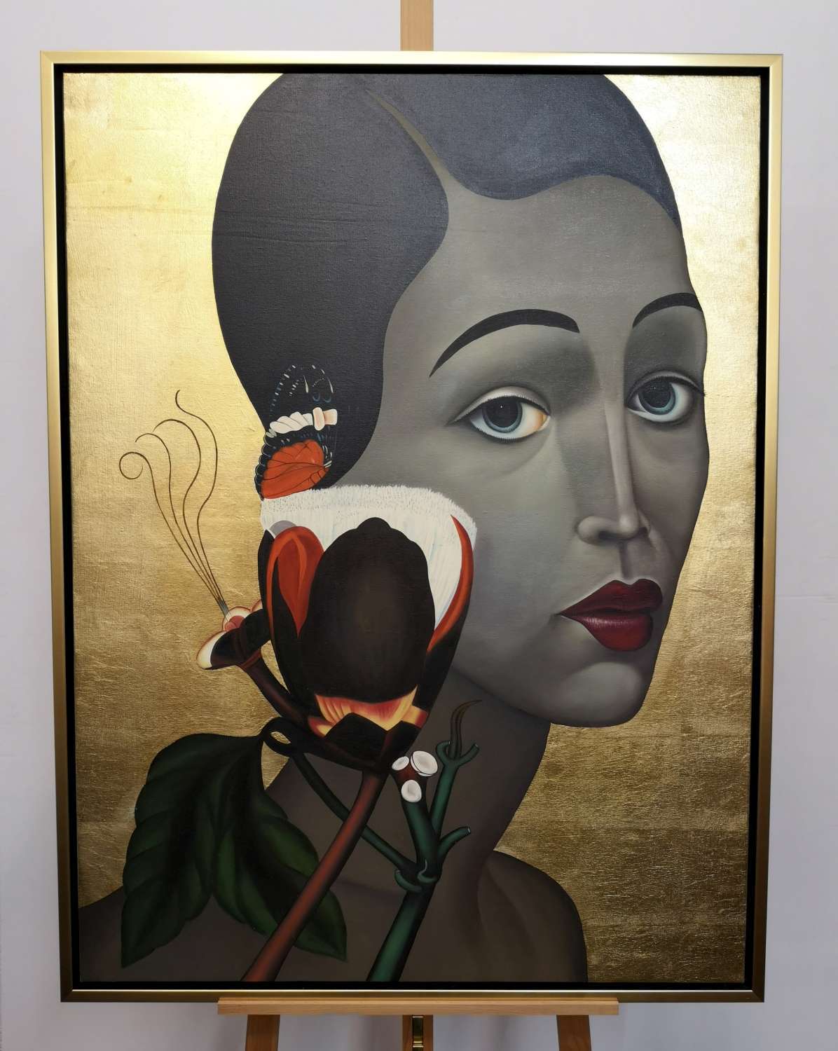 SD067G, Femme gold 1,peinture à l’huile et feuille d’ or, encadrement baguette gold, 95x125cm.